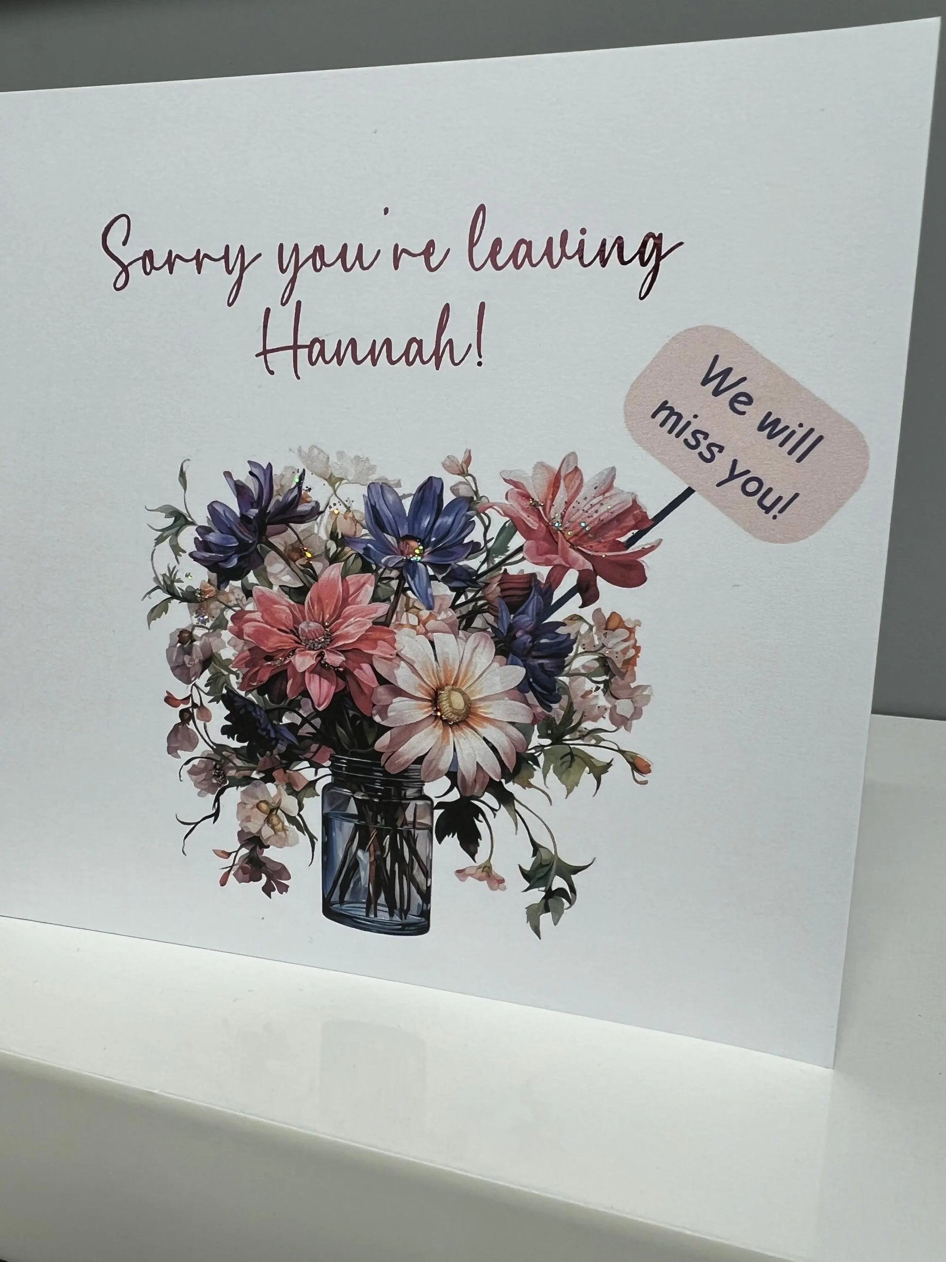 Sorry you are leaving card. Good luck card. Congratulations card. We will miss you card. All the best card. vase of flowers card foiled card